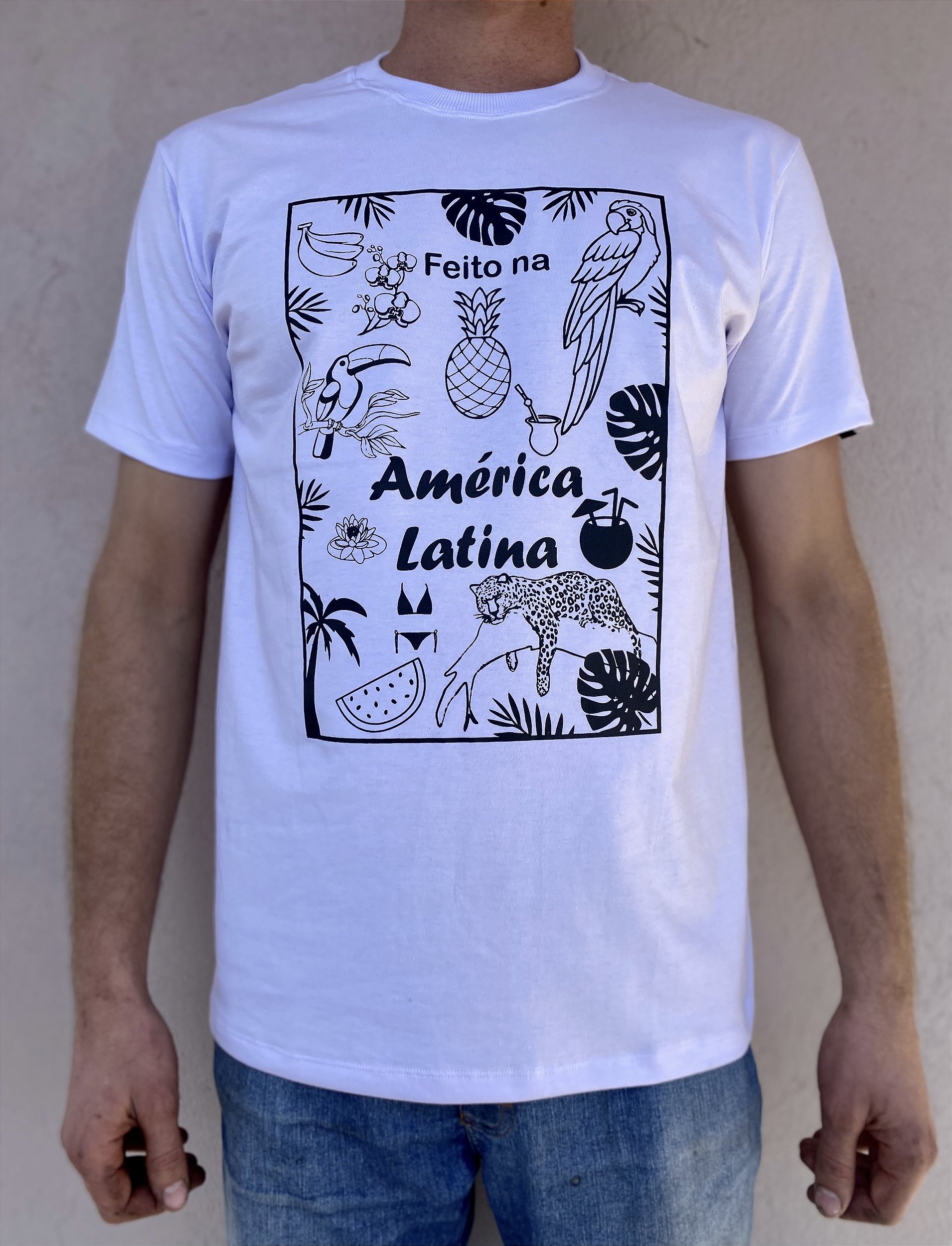 Estampa frontal exclusiva "Feito na América Latina" em serigrafia preta.