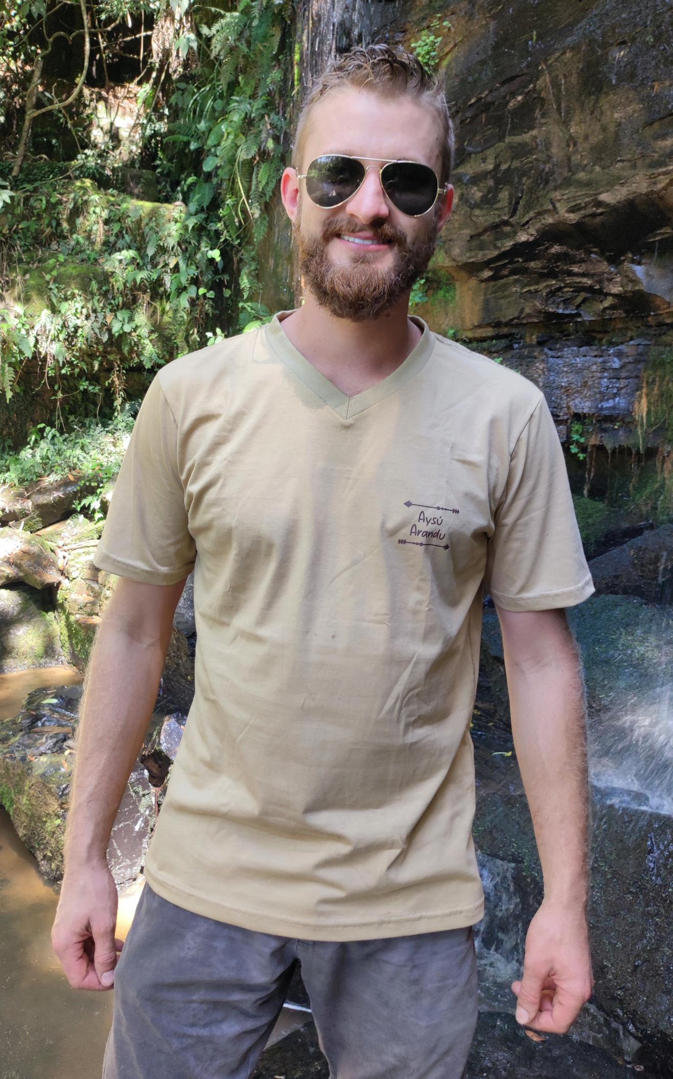 Camiseta gola V Aysú Arandu (Paz e Amor em Tupi-Guarani) em malha Ecológica 100% algodão orgânico cor Azul Hortência tingida com corantes de base natural, auxiliares químicos com base de óleo essencial da casca da laranja e amaciante produzido a partir da casca do arroz, gerando grande redução de químicos pesados, menor consumo de água e energia elétrica.