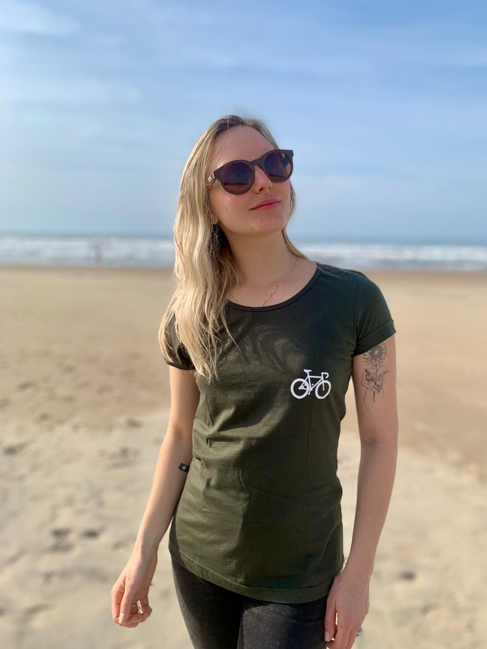 Baby Look Bike em malha verde militar 100% algodão orgânico (livre de agrotóxicos e pesticidas)