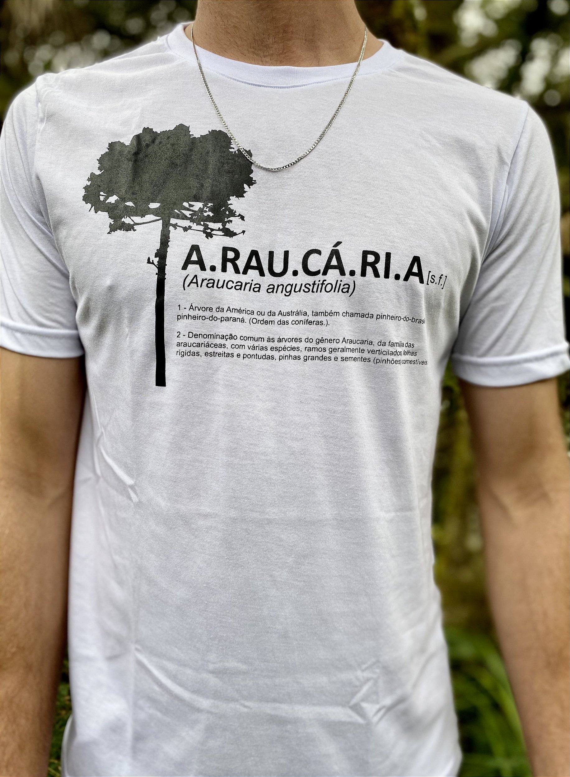 Camiseta Araucária II em malha branca Ecológica 50% algodão orgânico e 50% poliéster de garrafa PET Estampa frontal em serigrafia preta com Dicionário Araucária, o Pinheiro do Paraná Para os amantes da natureza! A cada peça comprada, você recebe sementinhas para plantar!