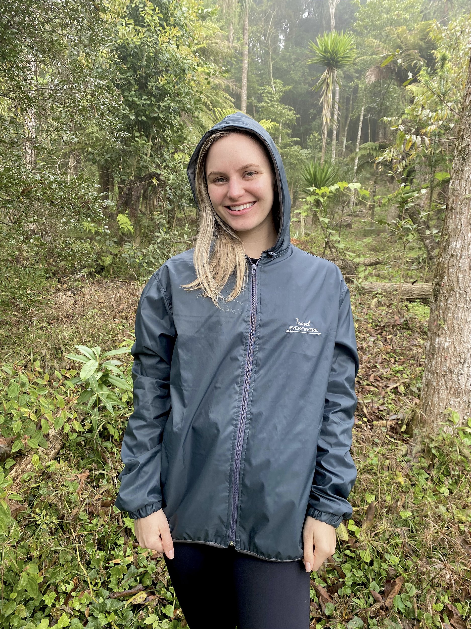 Possui forro em tela, bolso interno grande, bolsos laterais fechados com velcro, capuz com regulagem e punhos com elástico.