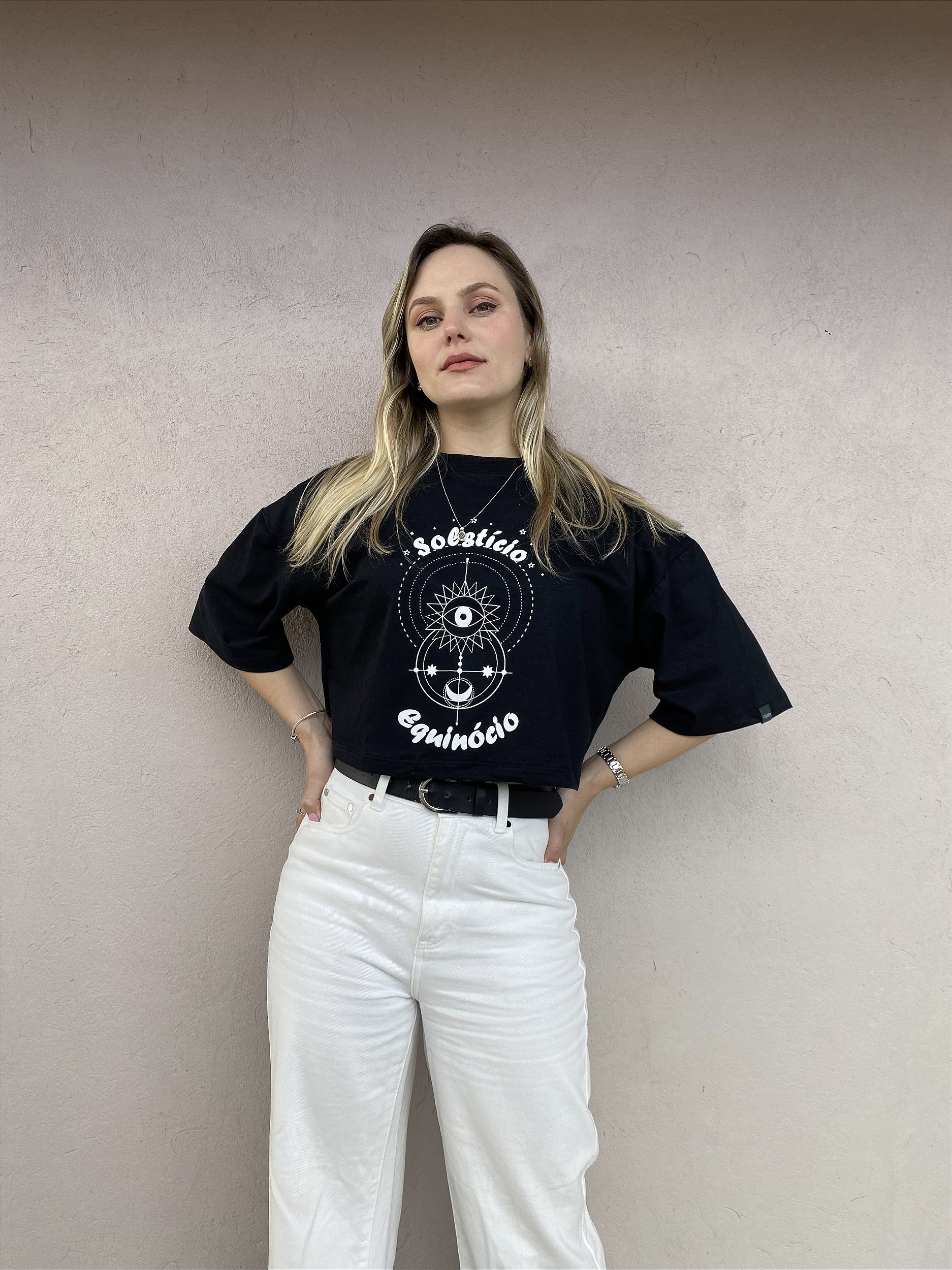 Cropped Solstício e Equinócio em malha Ecológica 50% algodão orgânico e 50% poliéster de garrafa PET reciclada cor Preta.
