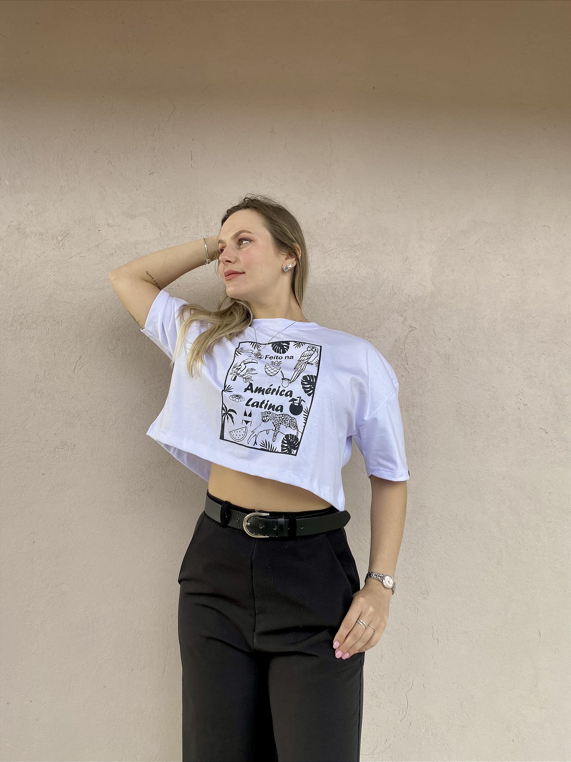 Estampa frontal exclusiva "Feito na América Latina" em serigrafia preta.